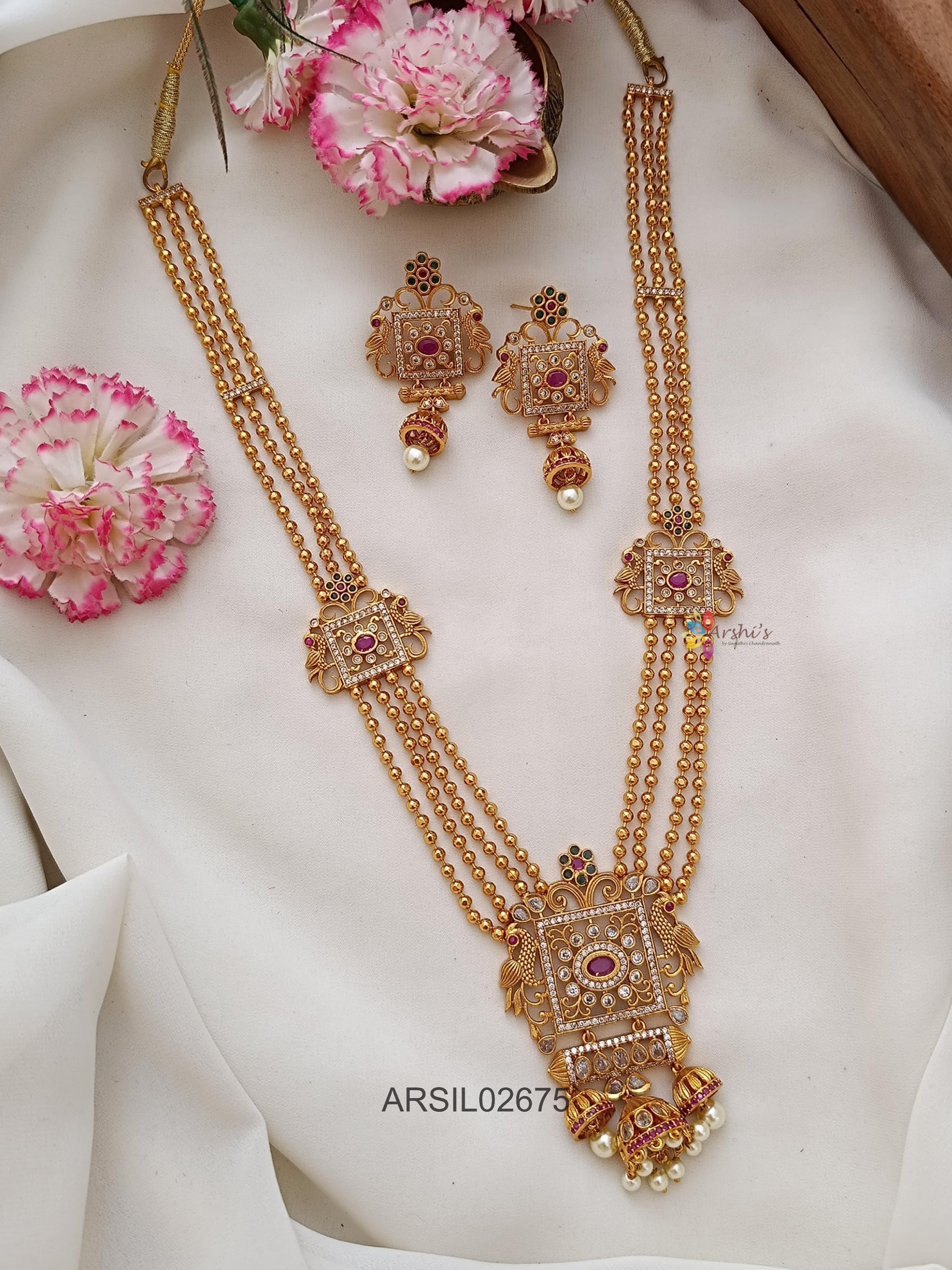 This Three Layer Gold Bead Long Haram features multiple strands of gleaming gold beads, creating a rich and elegant look. Perfect for weddings and festive occasions, it adds traditional charm and timeless sophistication to any outfit.