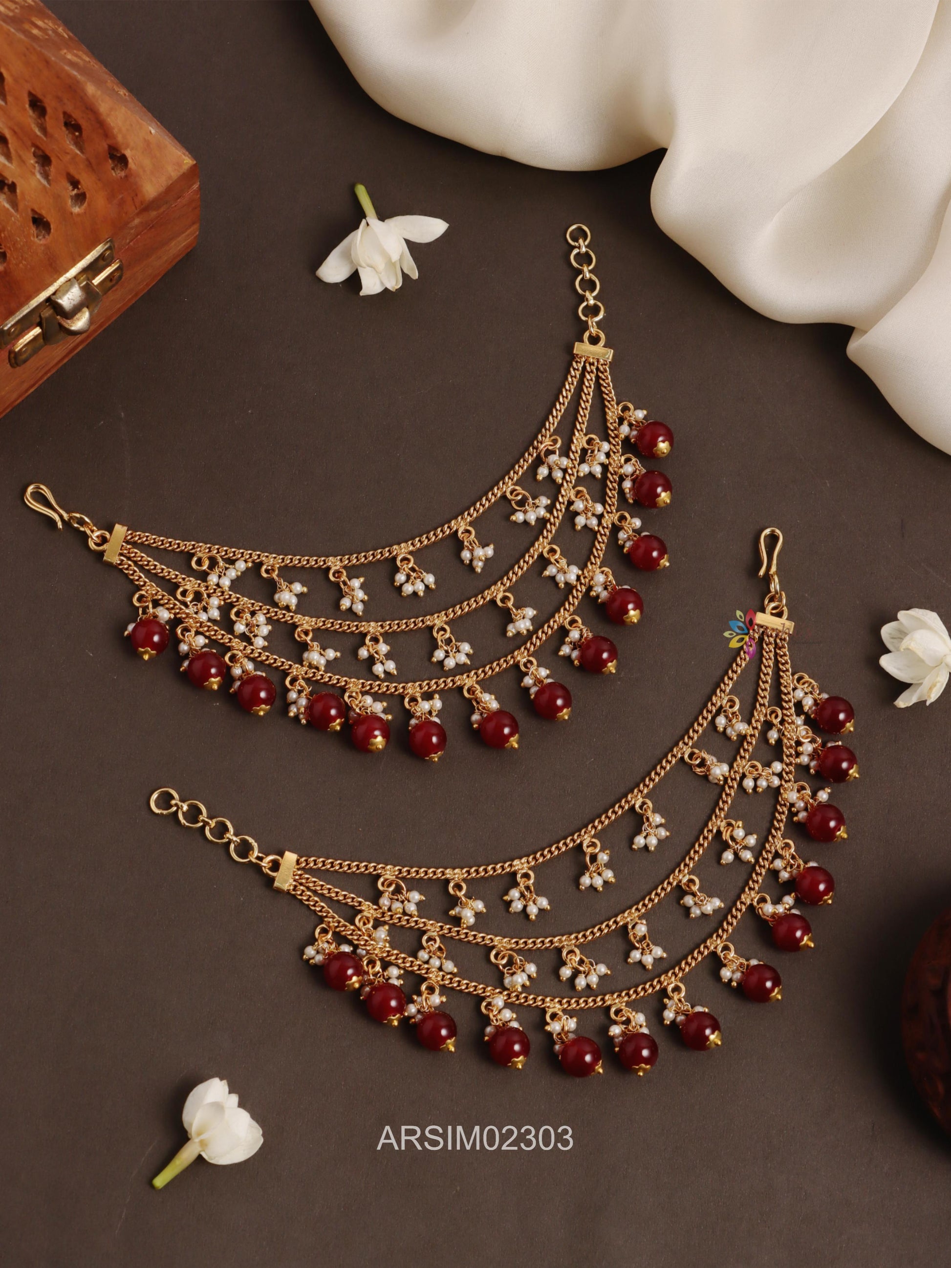 Three Layer Pearl and Red Bead Earchains feature three strands of pearls combined with red beads. Suitable for traditional and festive looks, they pair well with jhumkas, studs, and bridal earrings.
