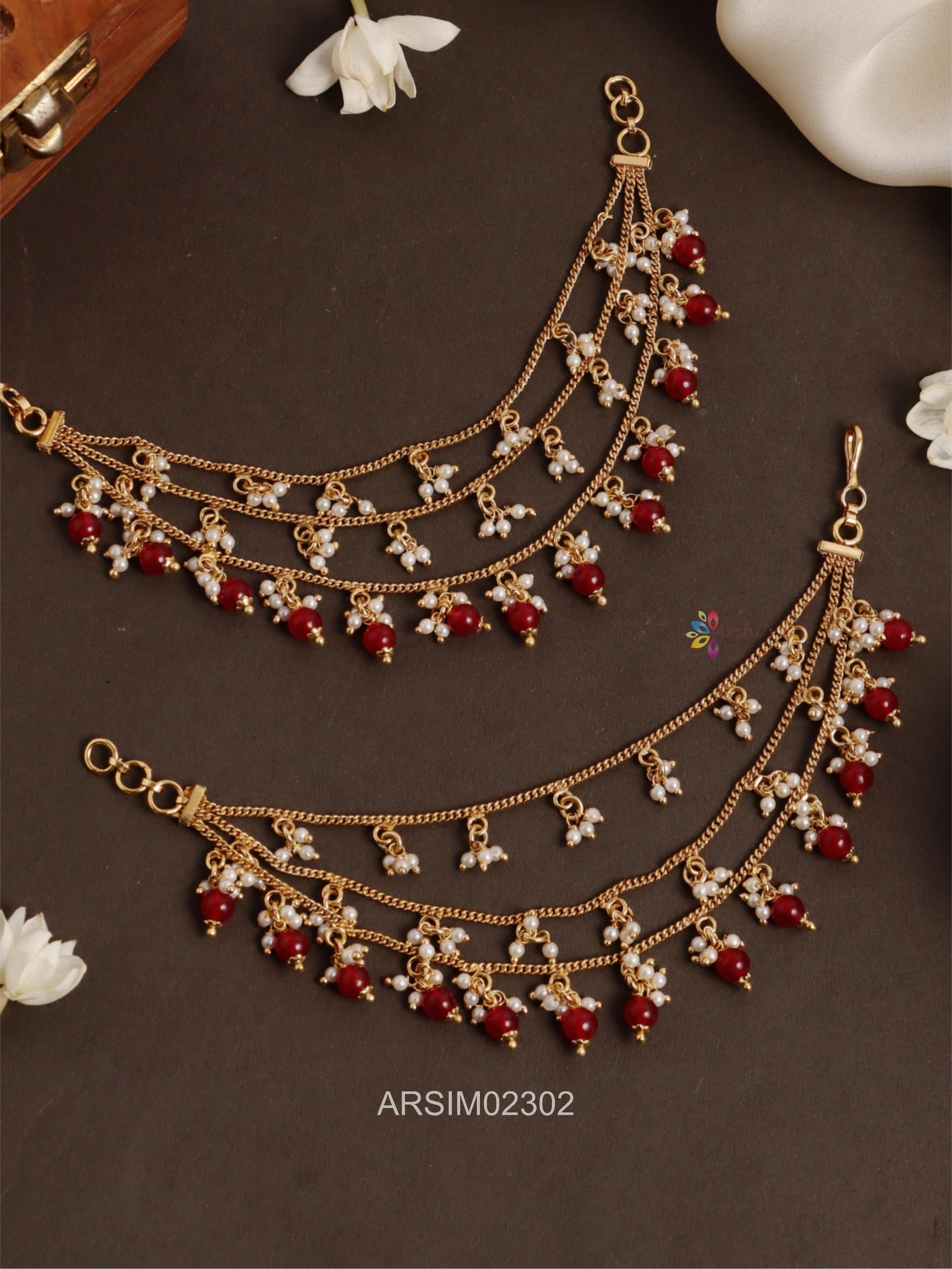 Three Layer Pearl and Small Red Bead Earchains feature layered strings of pearls accented with tiny red beads. Suitable for pairing with jhumkas or studs, they enhance traditional and bridal looks.