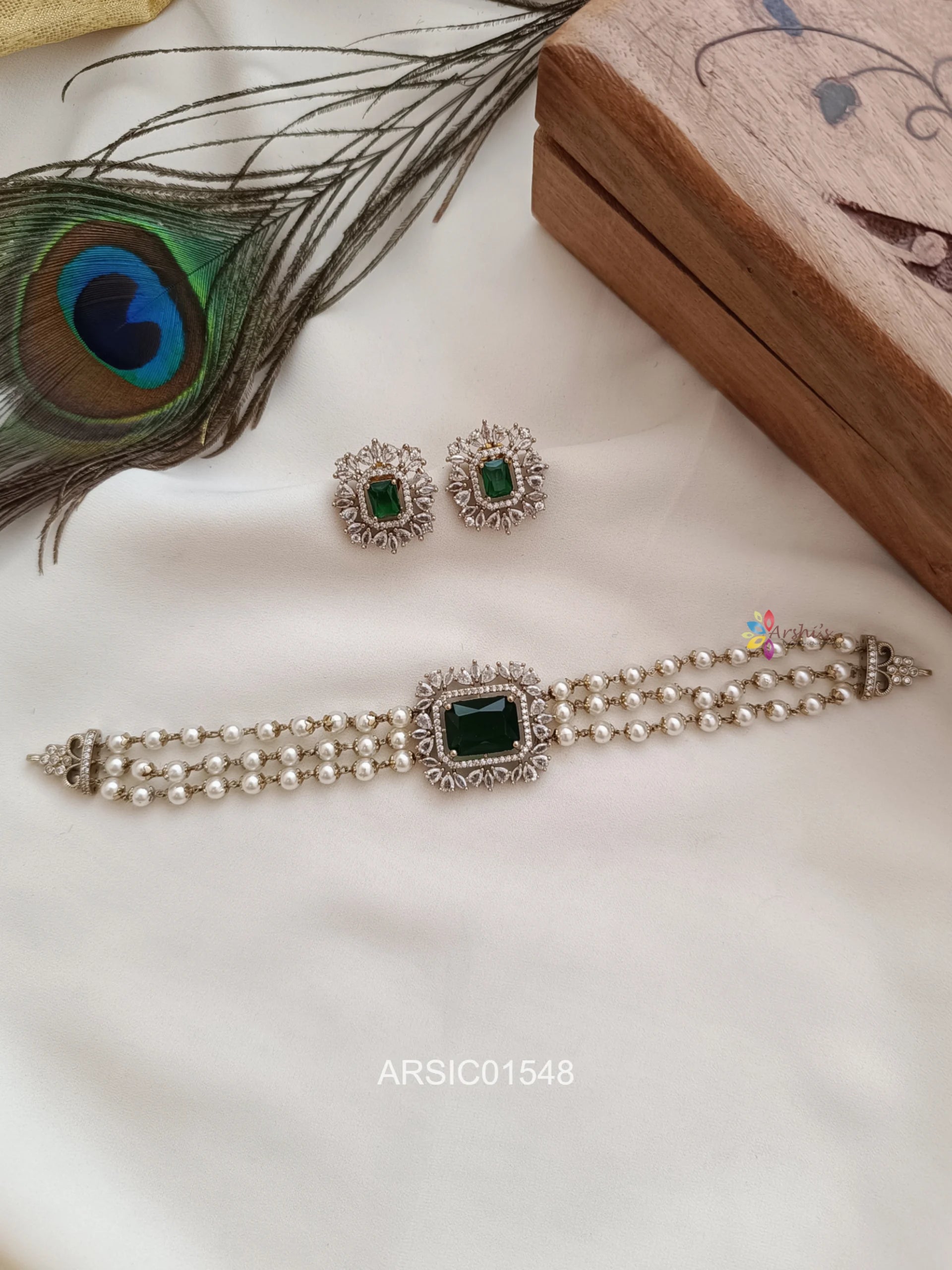 The Three Pearl Layer Emerald Stone Choker is a stunning piece that features three layers of lustrous pearls accented with vibrant emerald stones. This elegant choker blends classic sophistication with a touch of vibrant color, perfect for any special occasion.