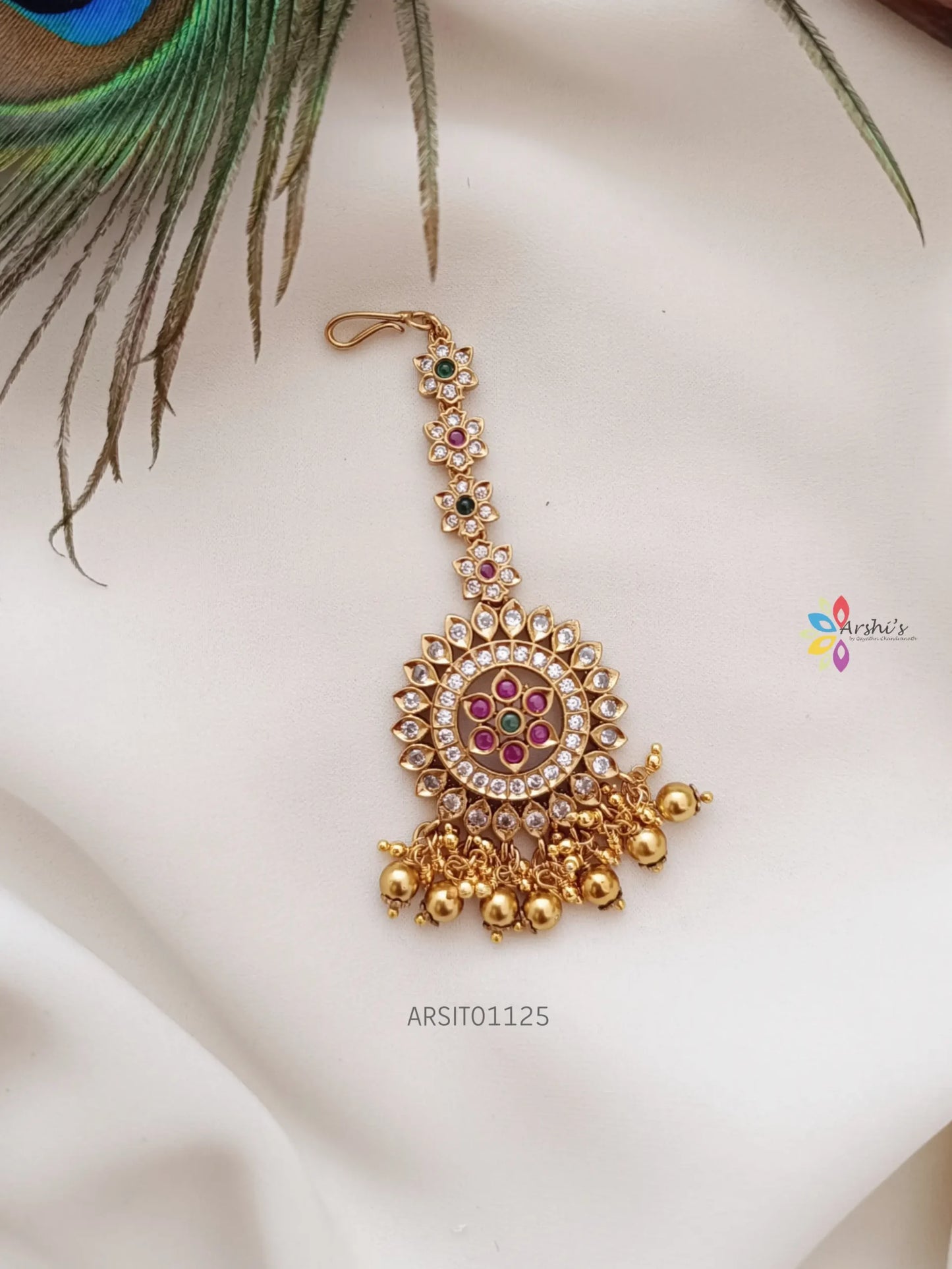 A trendy flower AD tikka is a stylish and contemporary forehead ornament that features a flower-shaped pendant adorned with American Diamond (AD) or cubic zirconia stones.