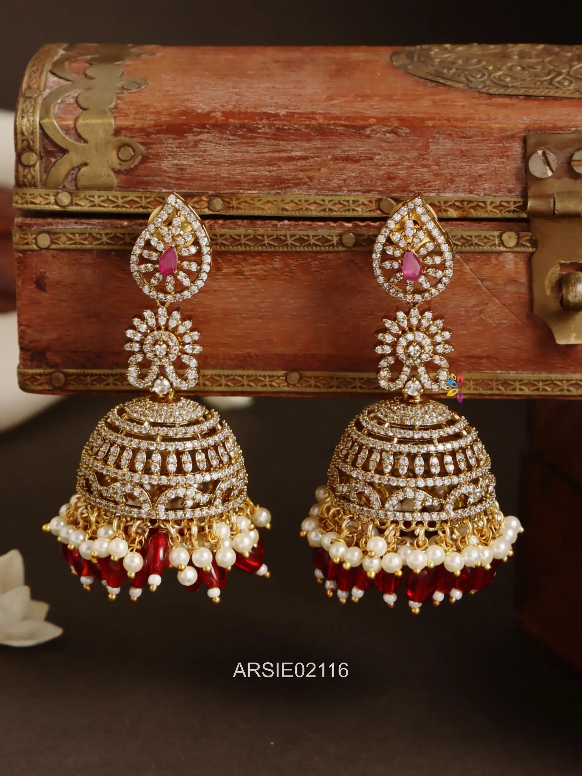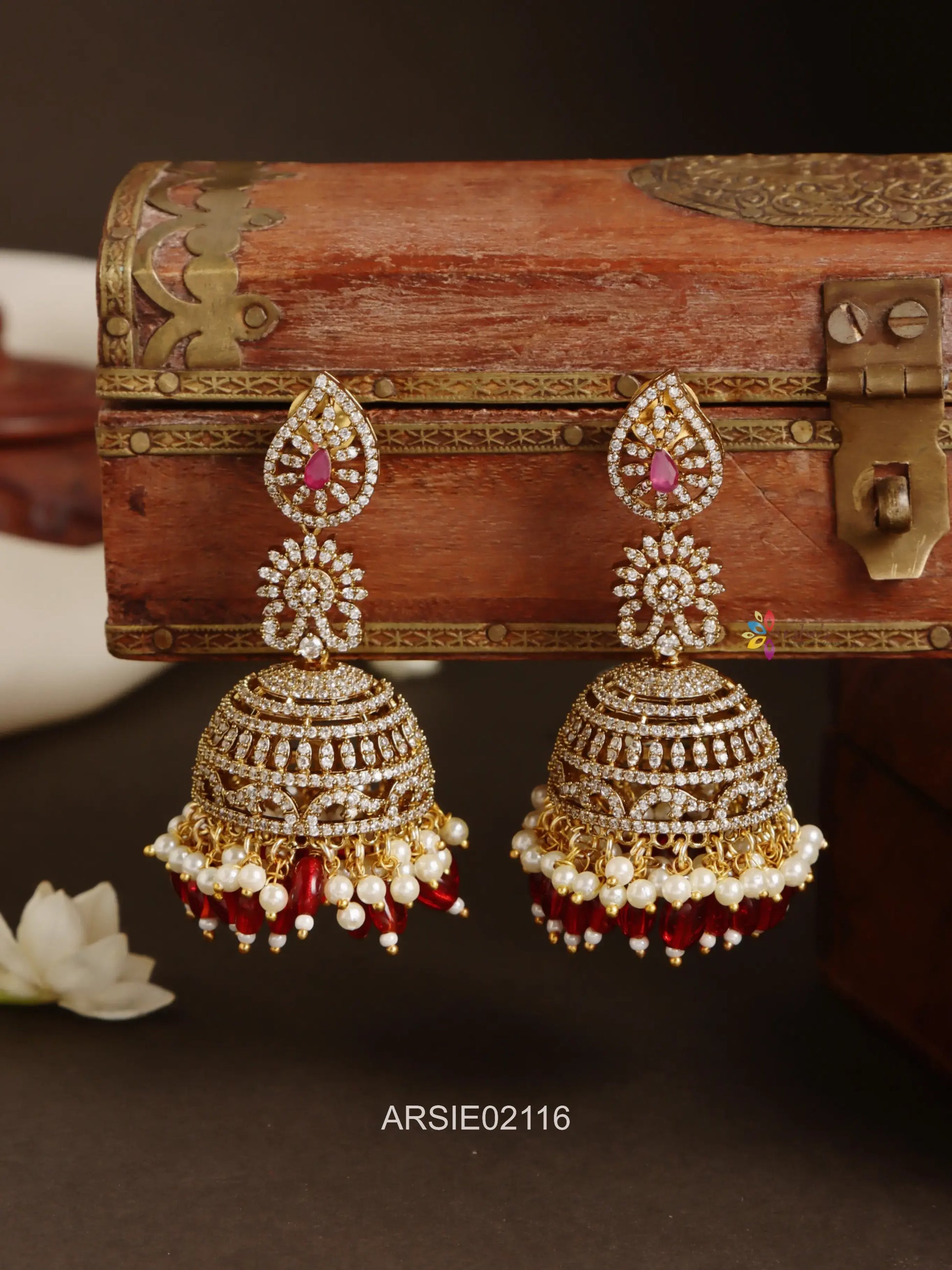 White AD Stone Pearl and Red Bead Jhumka