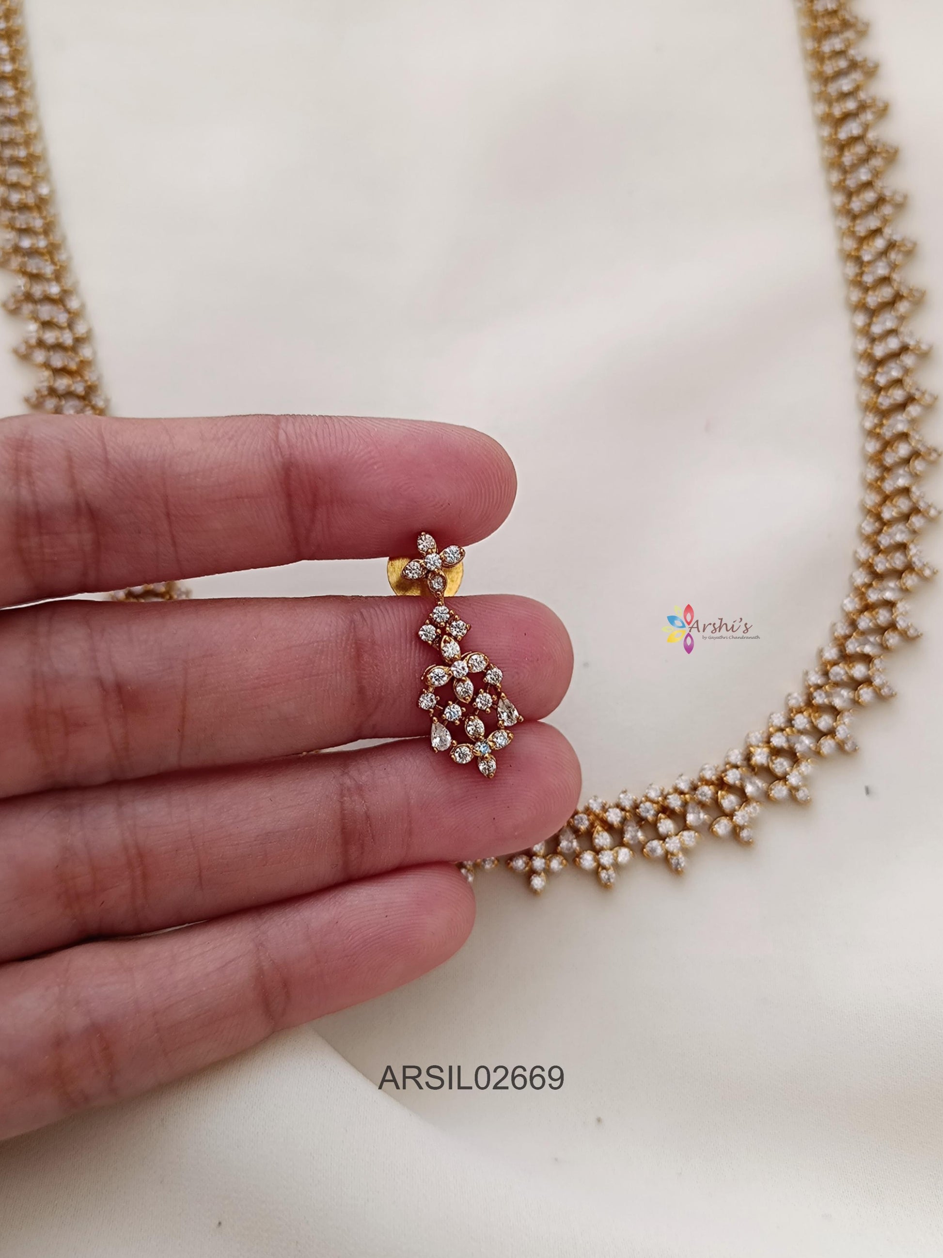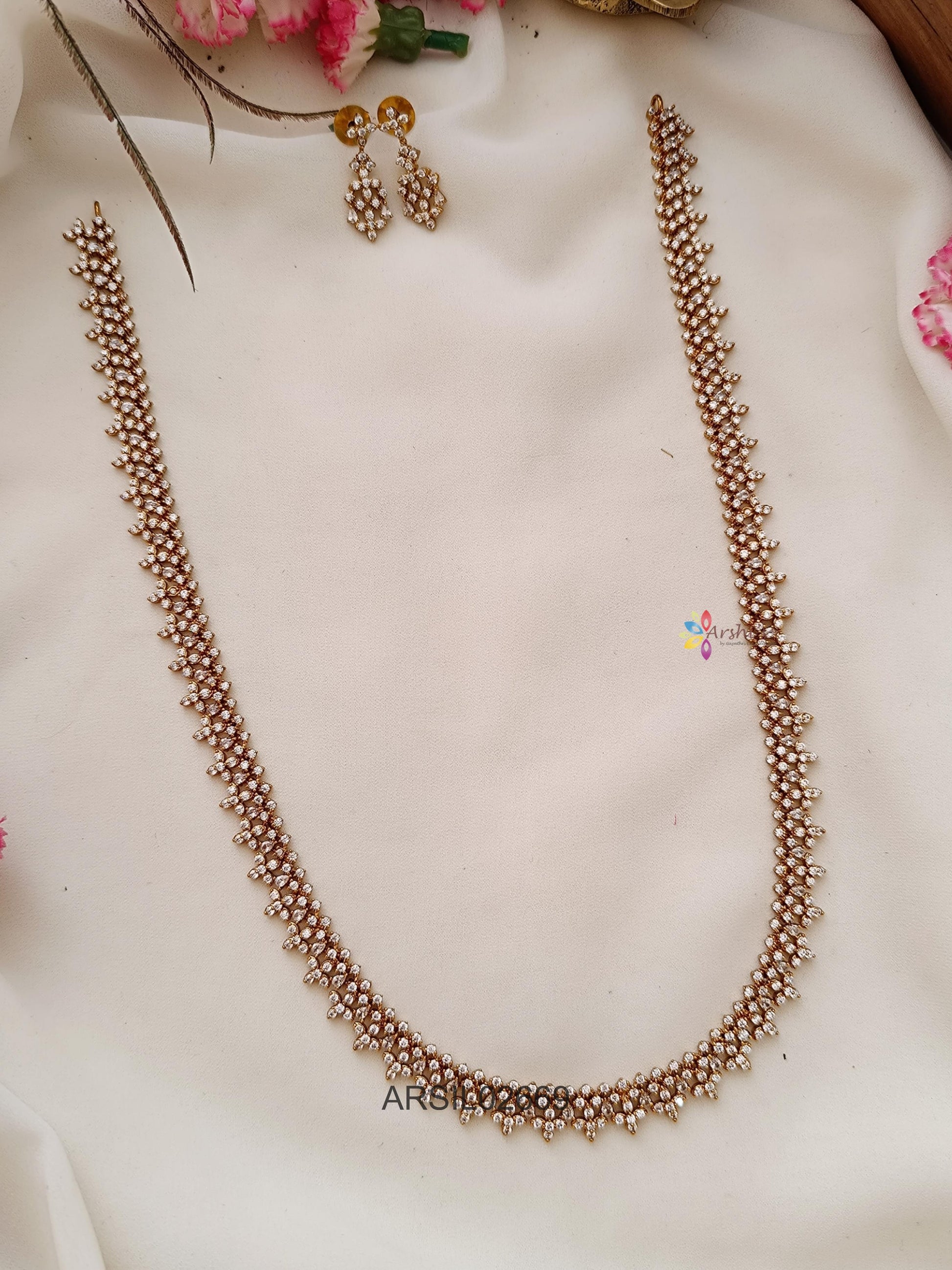 This White Stone Long Haram sparkles with dazzling white stones set in intricate patterns, offering a perfect blend of tradition and elegance. Ideal for weddings and festive occasions, it enhances any ethnic look beautifully.